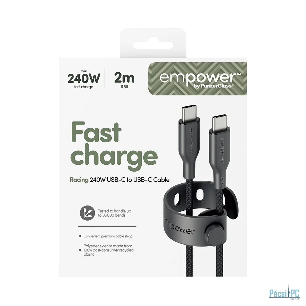 Empower by PanzerGlass® Racing USB-C-USB-C kábel akár 240 W-os teljesítményig azoknak készült, akik gyors töltést és kábelkezelést szeretnének. Használd MacBook, iPhone, Samsung, AirPods - vagy bármilyen más USB-C-vel rendelkező eszközhöz.