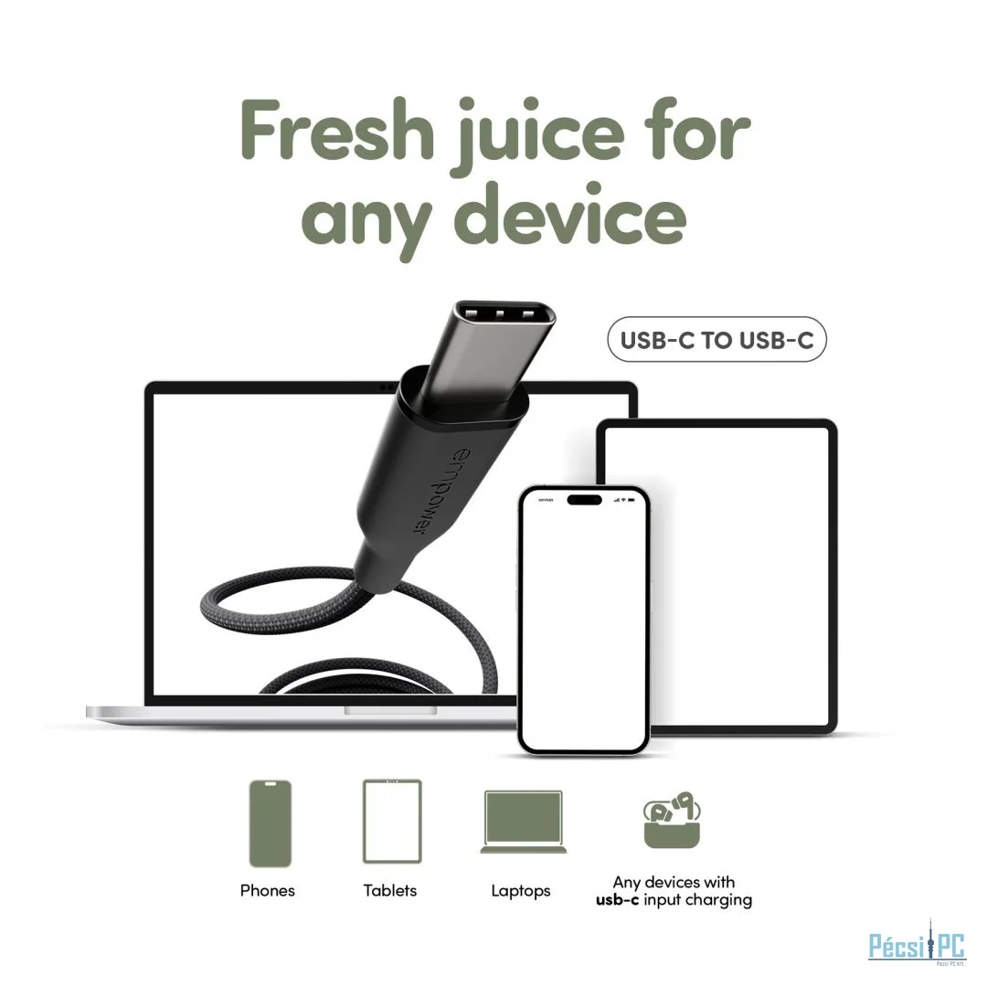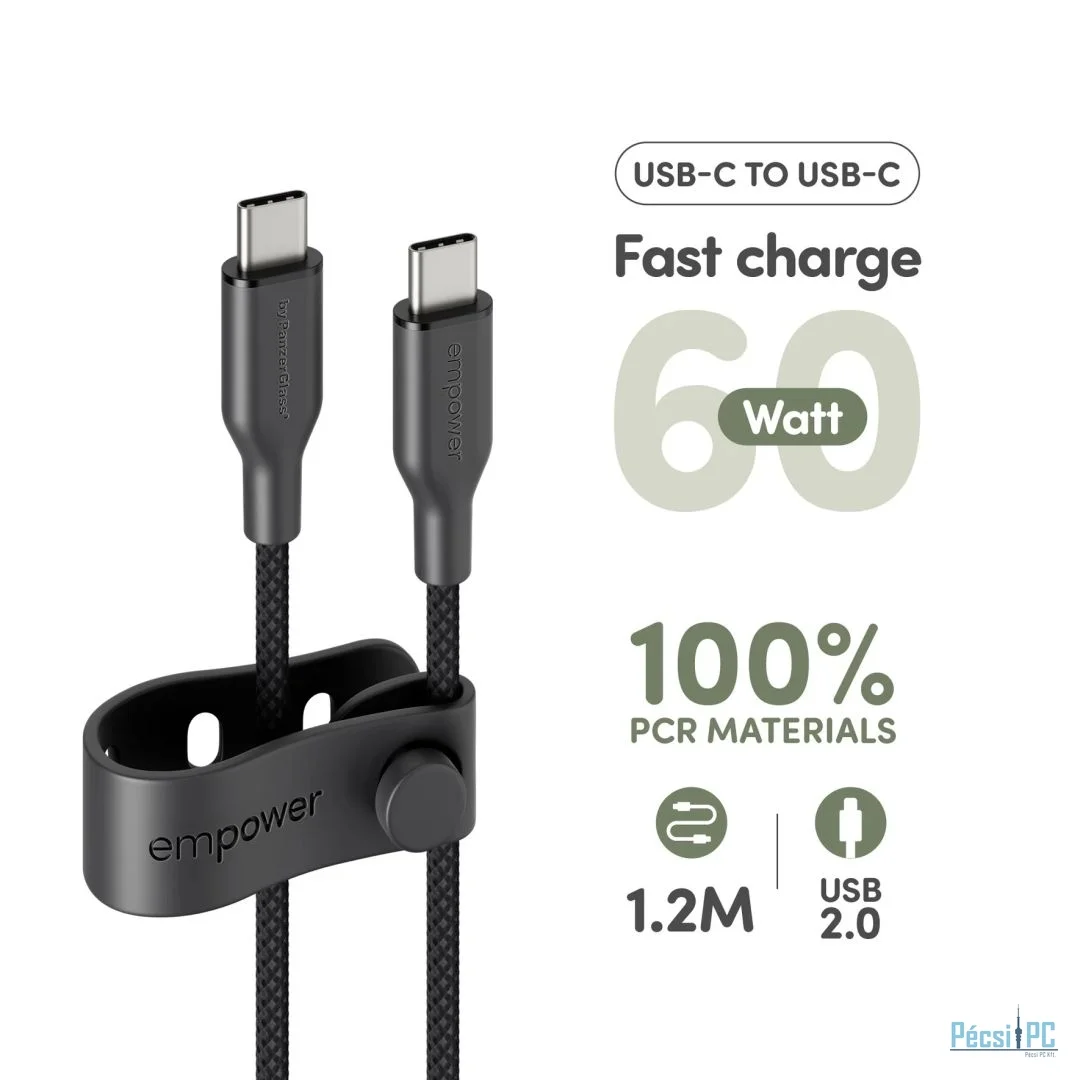 USB kábel, USB-C, USB-C, USB2.0, Male/Male, 1,2m, Black, Töltő és adatkábel, Szövetborítás