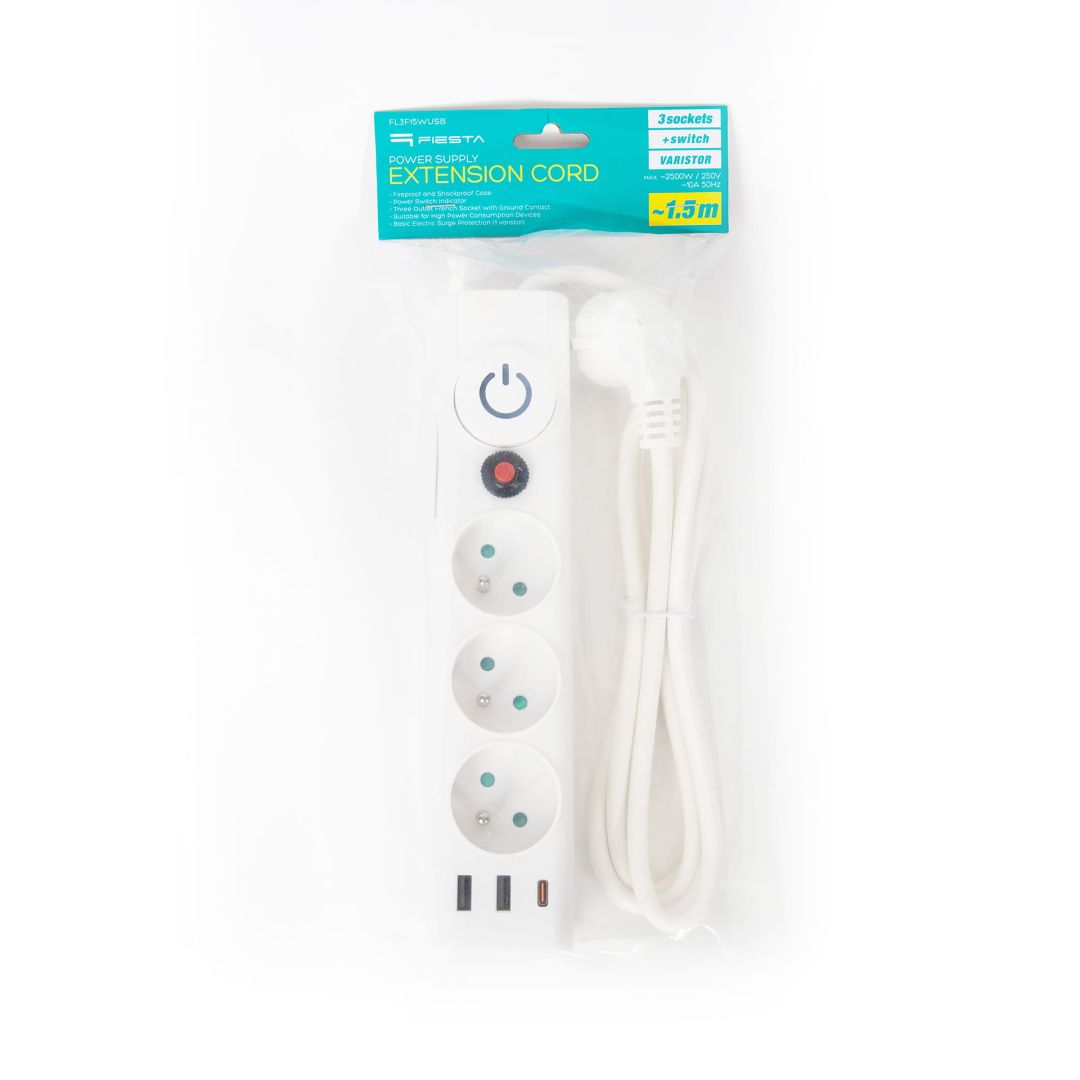 Elosztó, 3xDIN, 1,5m, Kapcsoló, USB, White