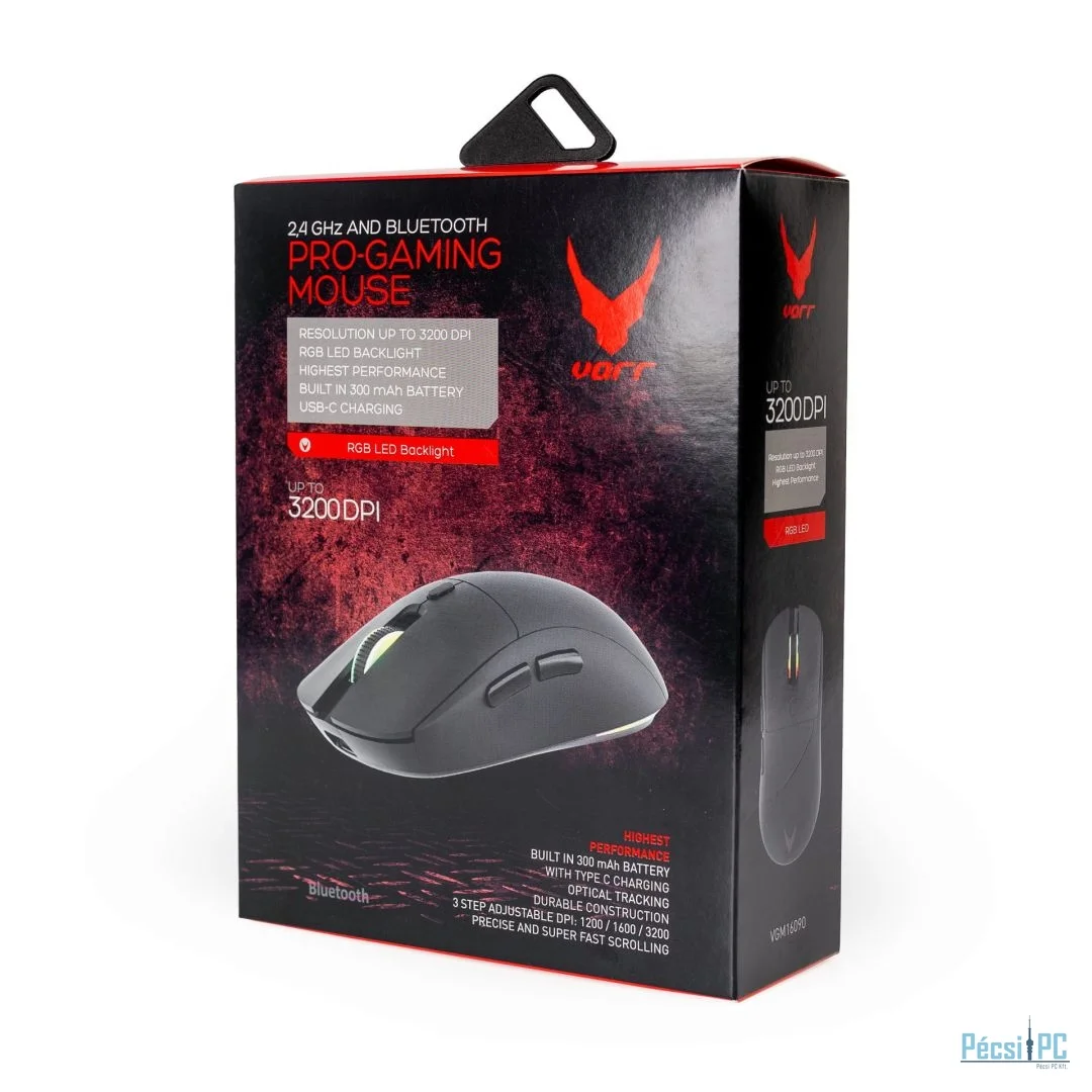 Vezeték nélküli, Wireless 2,4GHz, Bluetooth, Optikai, 3200DPI, Black, Újratölthető, RGB, Gamer