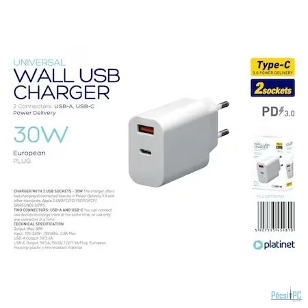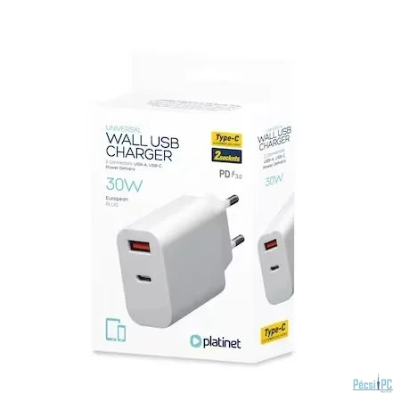 Platinet Wall Charger 30W USB Type C PD3.0+USB2.4A White