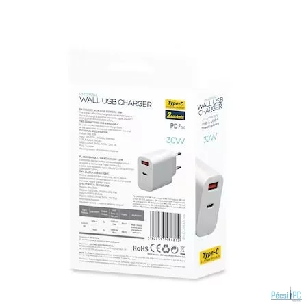 Adapter, 1xUSB-A, 1xUSB-C, 5V/9V/12V, 3A, 30W, PD, White