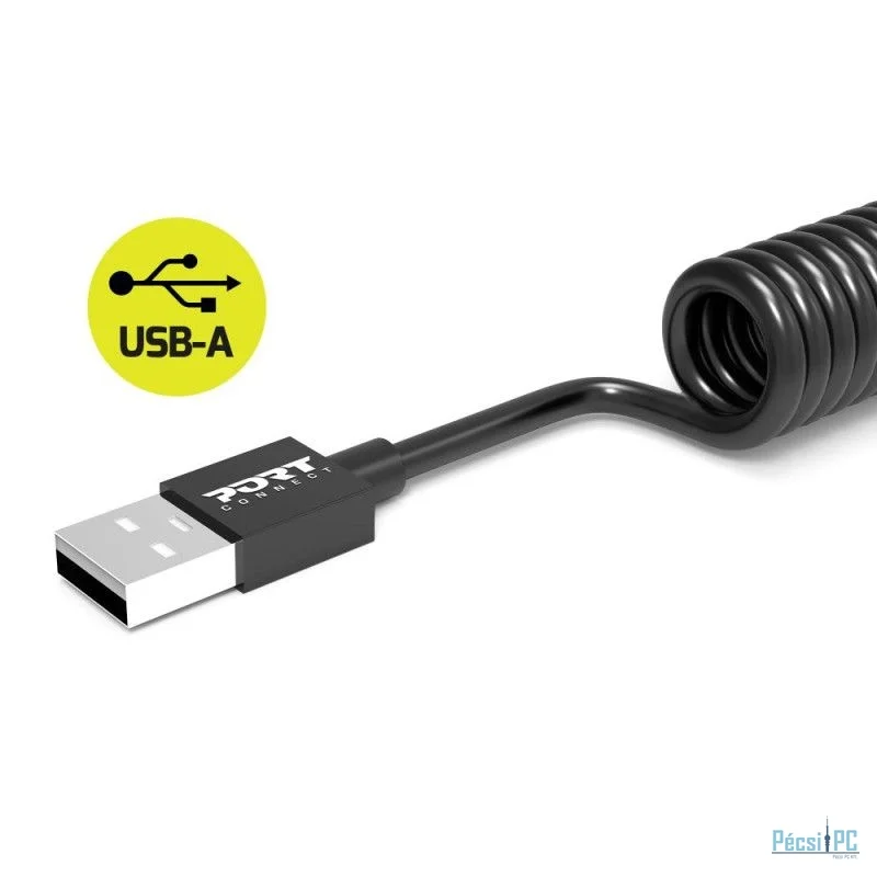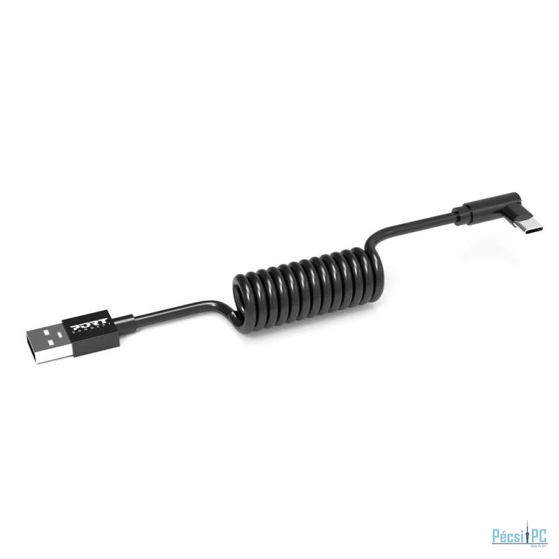 Port Designs 10 USB-C 90° Spring Spiral Cable - USB-A Black