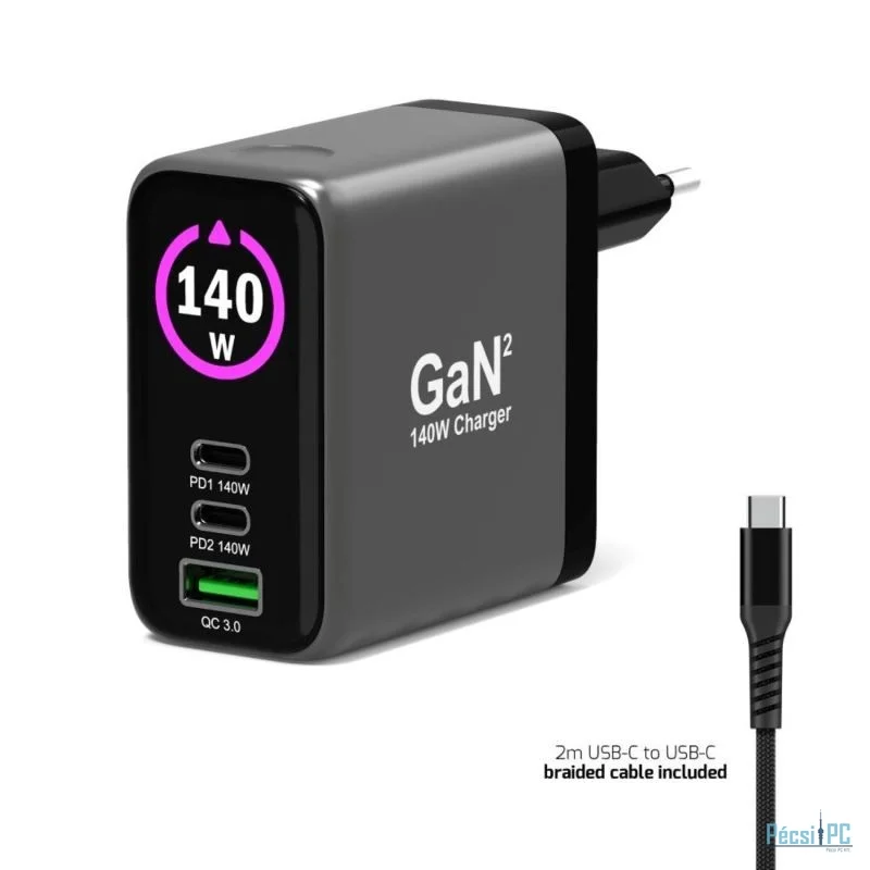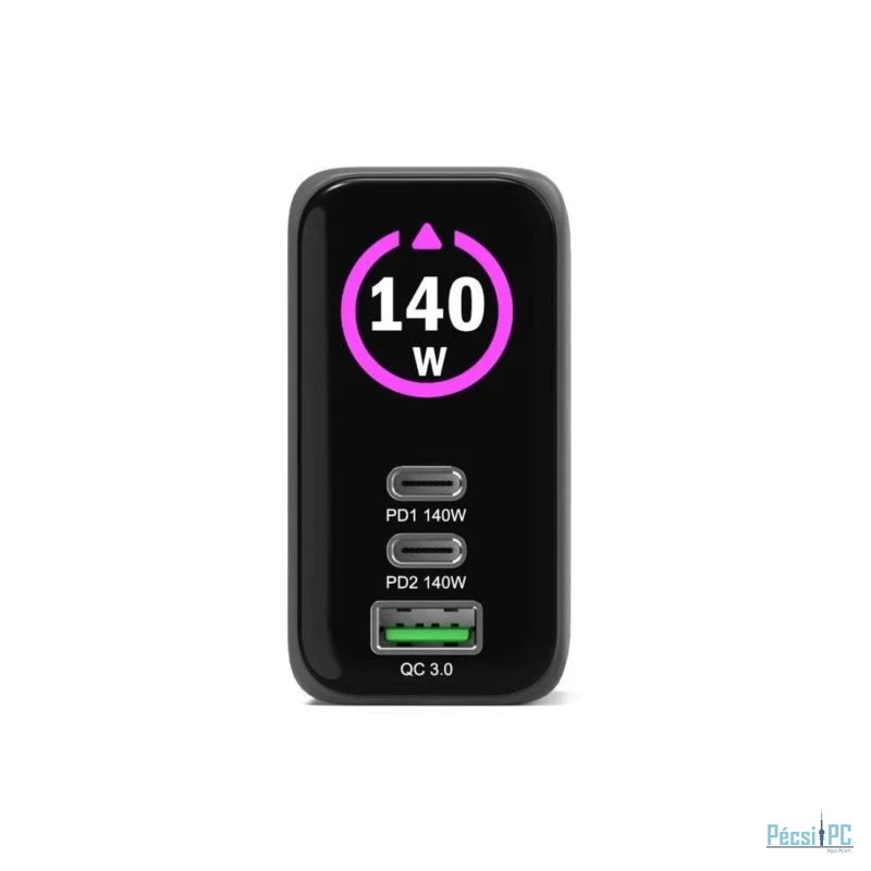 Hálózati töltő, 1xUSB-A, 2xUSB-C, Kábel csatlakozó USB-C , 5V/9V/12V/15V/20V/28V, 5A, 140W, QC, PD, Black