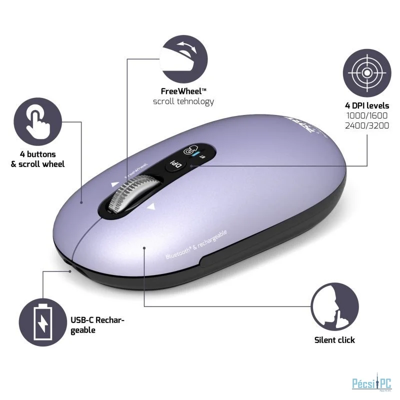 Vezeték nélküli, Wireless 2,4GHz, Bluetooth, Optikai, 3200DPI, Lavender, Újratölthető