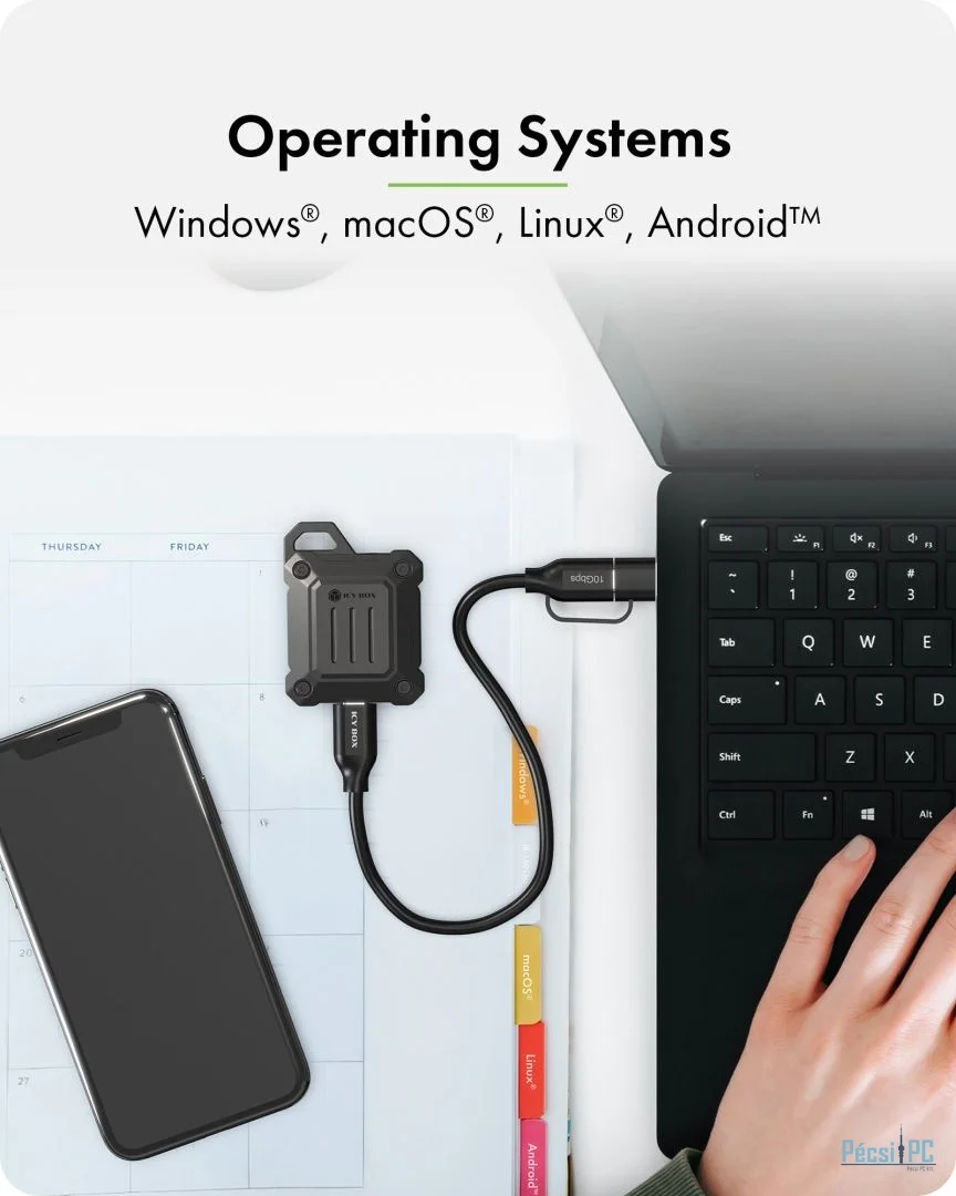 A Windows®, macOS®, Linux® és Android™ rendszerekkel kompatibilis, így a ház több platformon is működik. Rugalmasságot biztosít ahhoz, hogy az SSD meghajtót az eszközök széles skáláján használhassa.