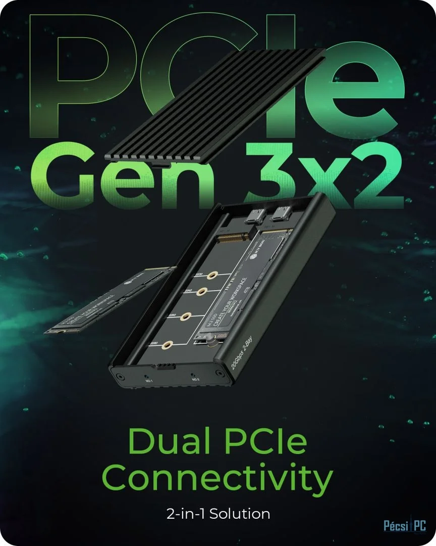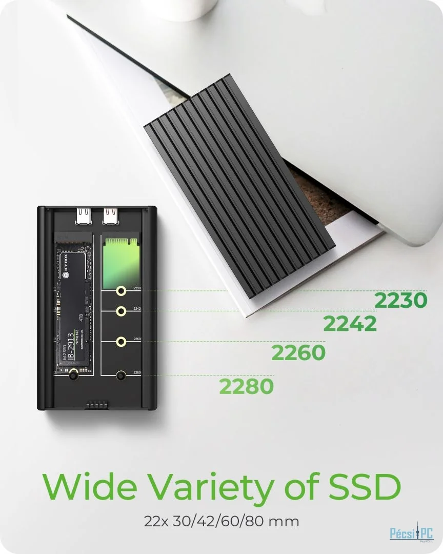 A 22x 30/42/60/80 mm-es SSD-khez tervezett ház biztosítja a kompatibilitást anélkül, hogy minden mérethez különböző egységekre lenne szükség. Ez a sokoldalúság leegyszerűsíti az SSD-k kezelését és növeli a funkcionalitást.
