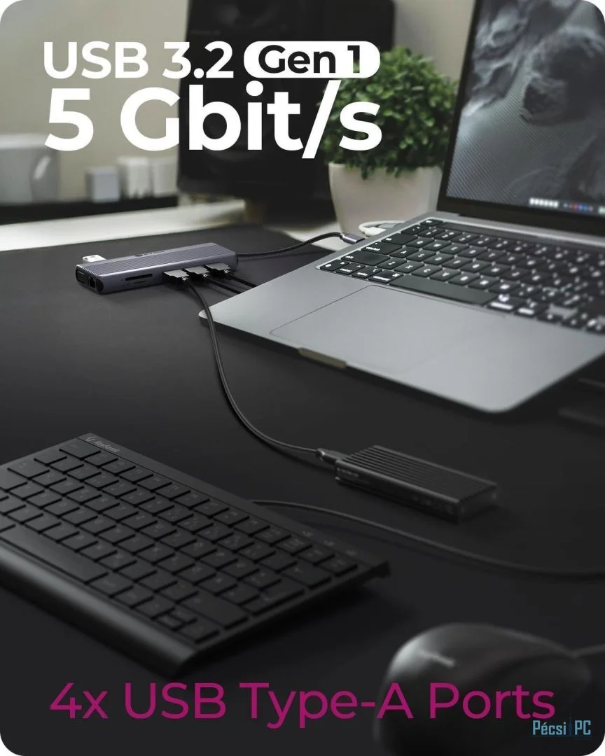 Csatlakozás USB-C, 4xUSB-A, 1xUSB-C, 2xHDMI, RJ45, 3.5mm jack, Kártyaolvasó
