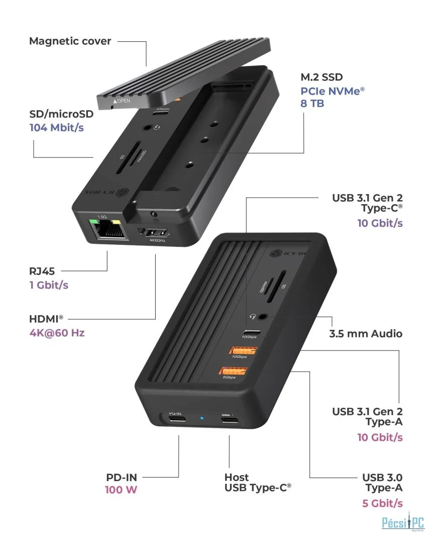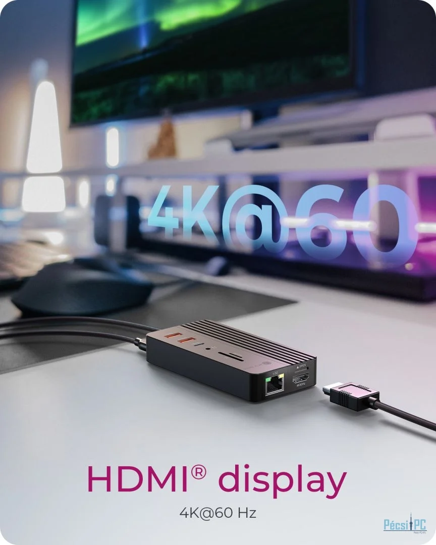 A beépített HDMI-port éles és részletes képi megjelenítést biztosít maximális 4K felbontással 60 Hz-en. Akár egy második képernyőre van szüksége a többfeladatos munkavégzéshez, akár egy kibővített kijelzőre a prezentációkhoz, vagy egy nagyobb munkaterületre a kreatív projektekhez, ez a dokkolóállomás nagyfelbontású videokimenetet biztosít.