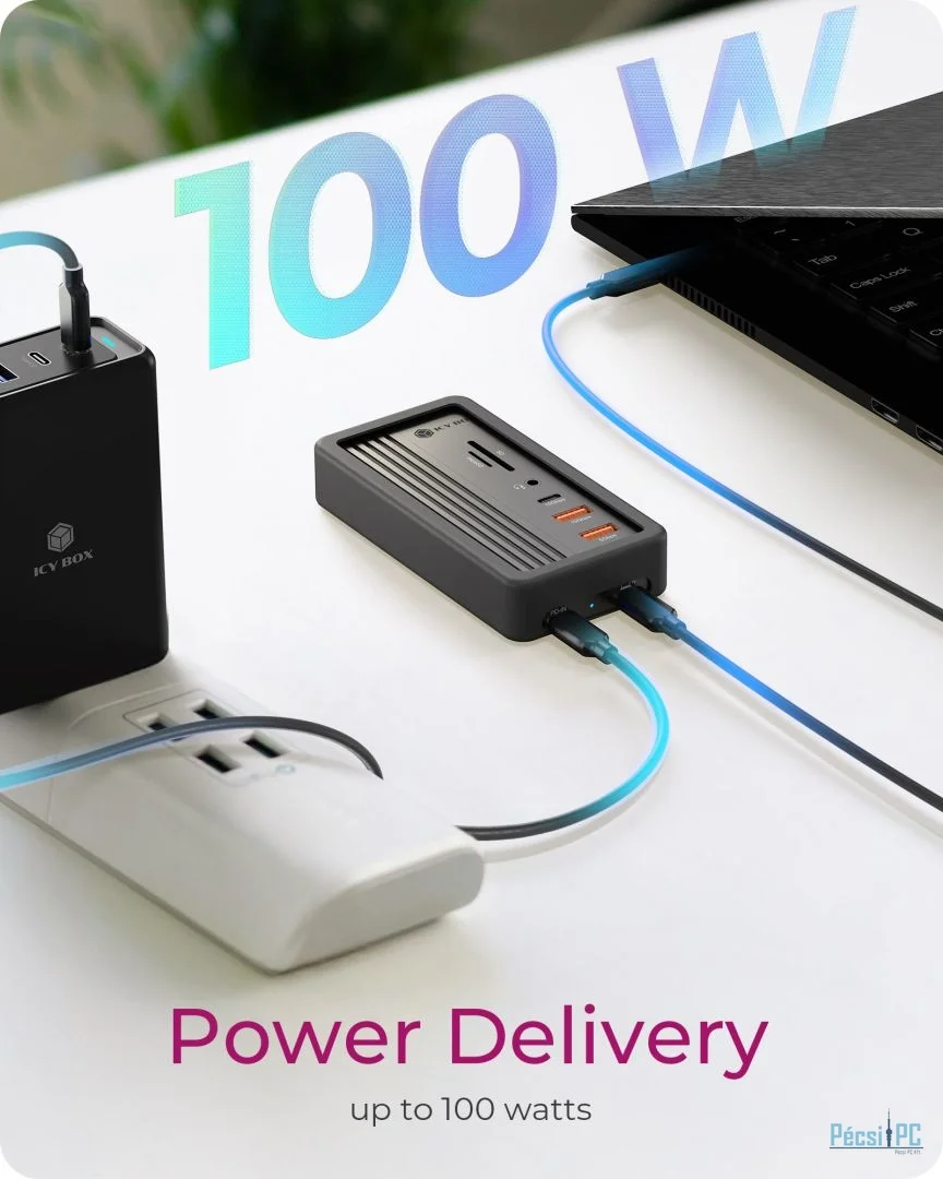 Maradjon áramellátásban egész nap az akár 100 wattos energiaellátást támogató USB Type-C PD-IN porttal. Egyszerűen csatlakoztassa USB Type-C tápegységét, hogy a DockingStation és a csatlakoztatott eszközök töltve maradjanak, anélkül, hogy további adapterekre lenne szükség, vagy hogy a munkaterületet zsúfolná.