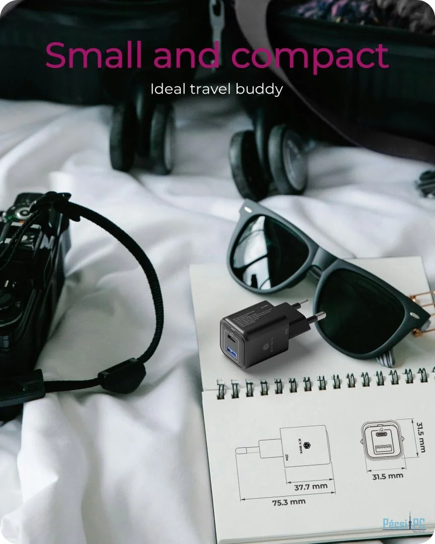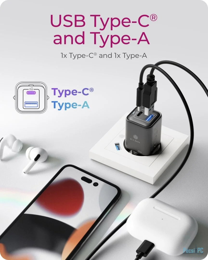 Adapter, 1xUSB-A, 1xUSB-C, 20W, QC, PD, Black