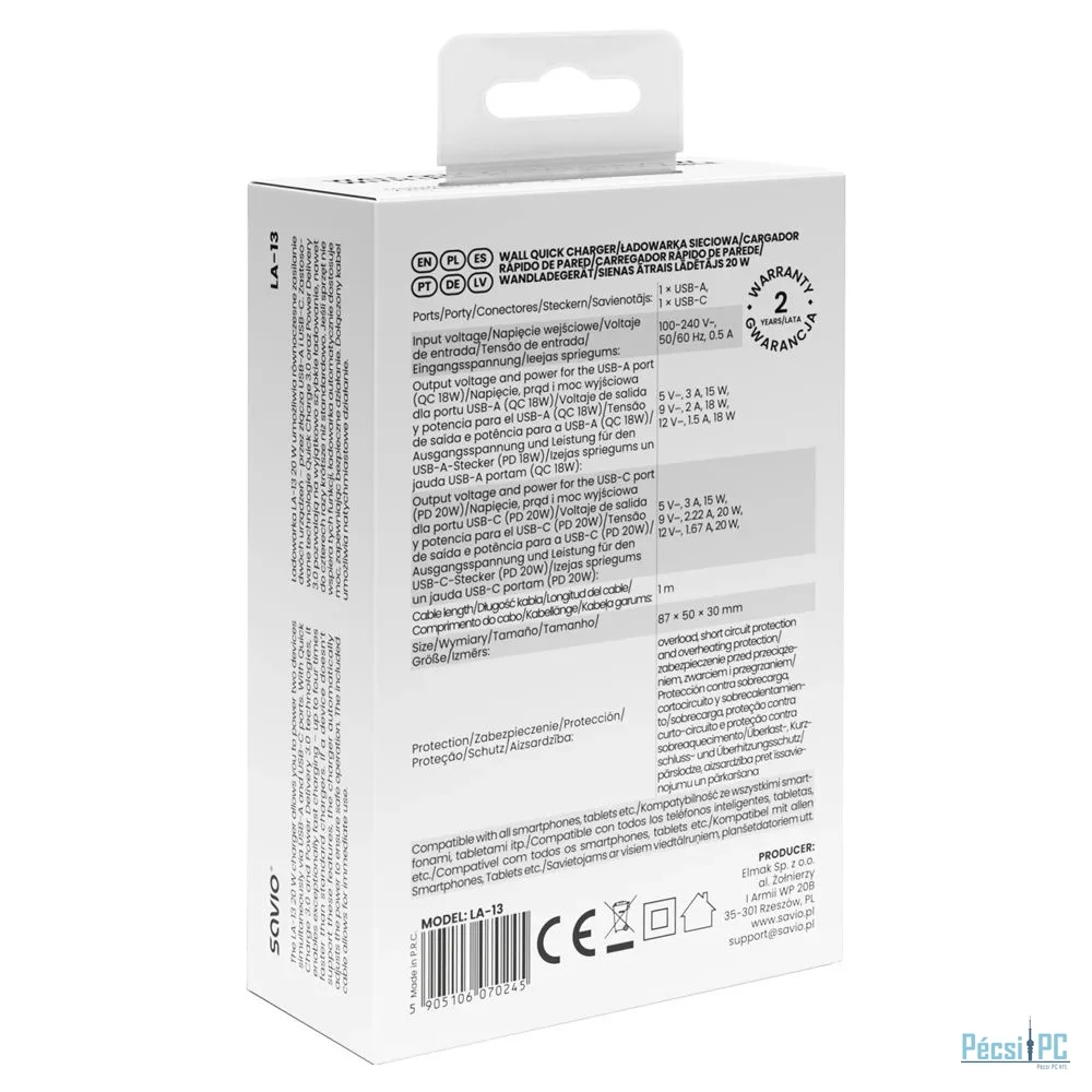 Savio LA-13 Wall quick charger 20W with USB-C cable White