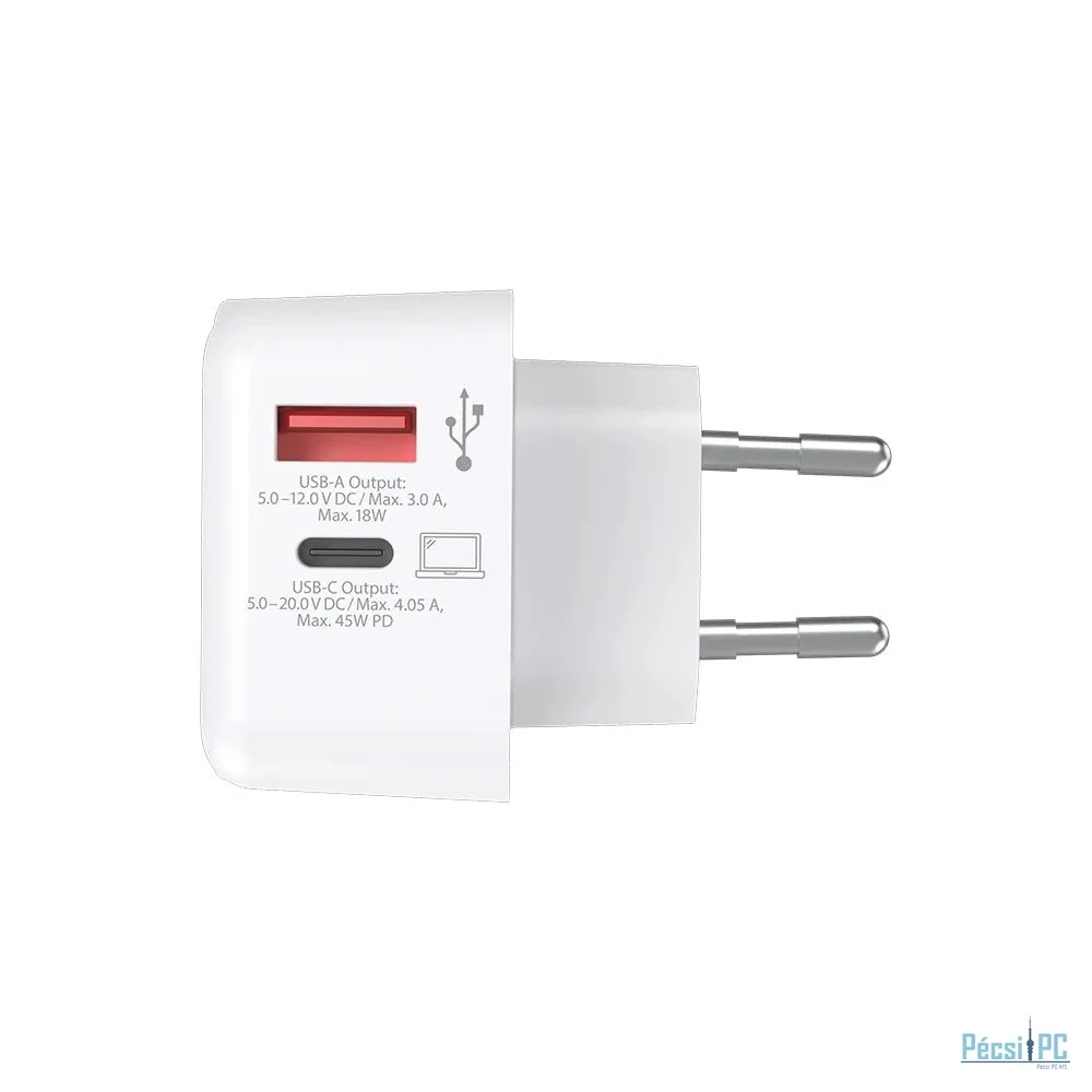 Hálózati töltő, 1xUSB-A, 1xUSB-C, Kábel csatlakozó USB-C , 5V/9V/12V, 3A, 45W, PD, White