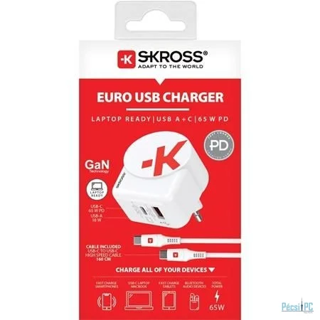 SKROSS 1xUSB-A 1xUSB-C PD 65W hálózati adapter White