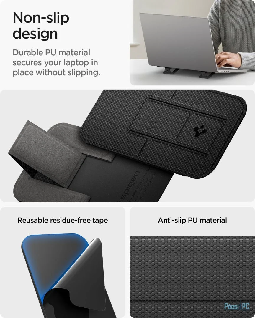 Stabil, csúszásmentes alátámasztás: A texturált csúszásgátló PU anyag biztonságosan a helyén tartja a laptopot, megakadályozva a csúszást gépelés vagy böngészés közben.