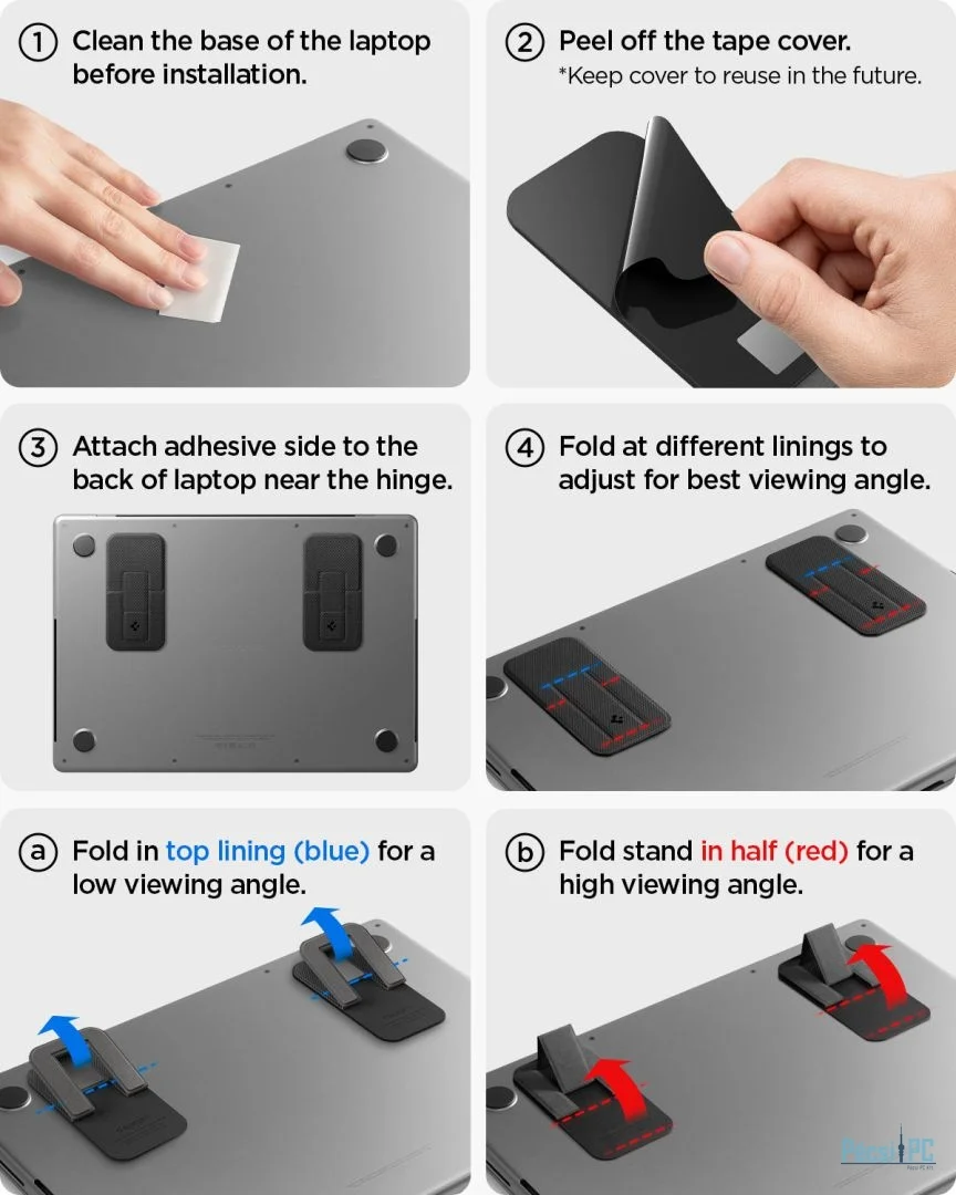 Állítható nézet a jobb ergonómia érdekében: Könnyedén összecsukhatja az állványt az optimális betekintési szög eléréséhez, amely segít csökkenteni a nyak megterhelését és javítja a testtartást a hosszú munkamenetek során.