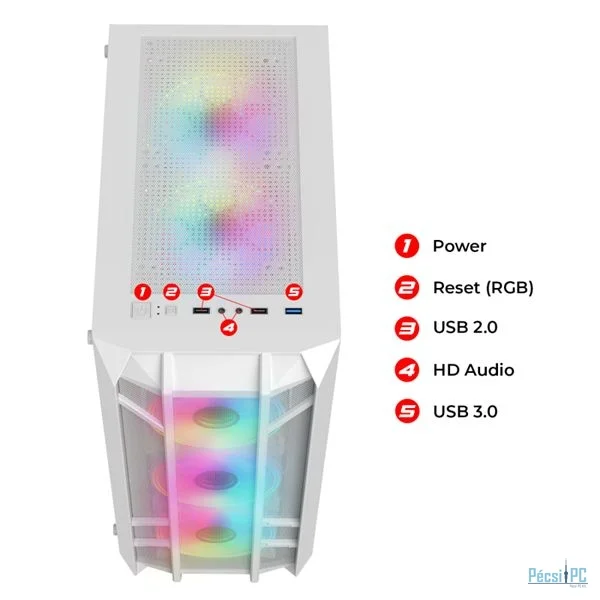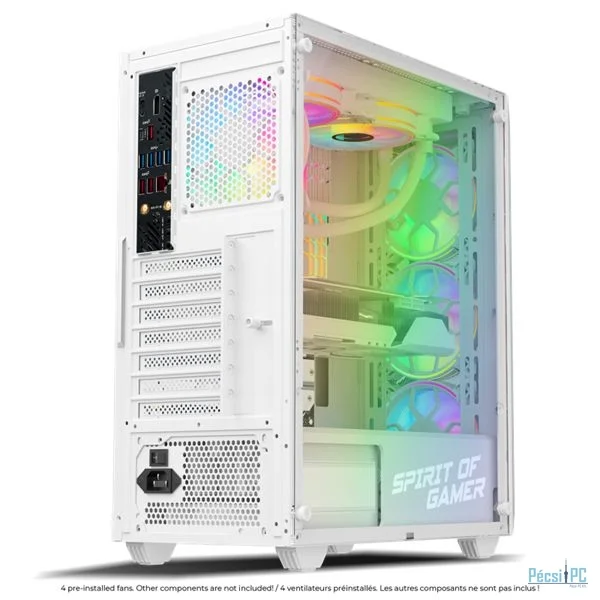 ATX, White, 2x3,5", 2x2,5", 2xUSB2.0, 1xUSB3.0, Audio, Táp nélkül, 495x440x255mm, Ventilátor:4x12cm, Tempered glass window, RGB, Gamer