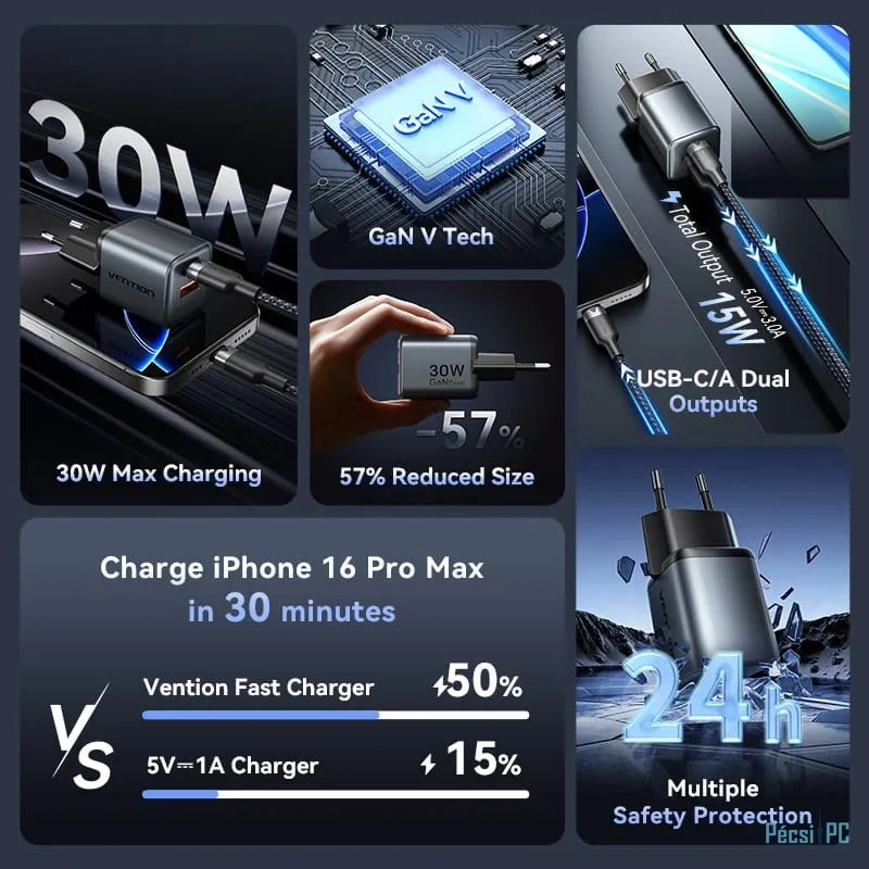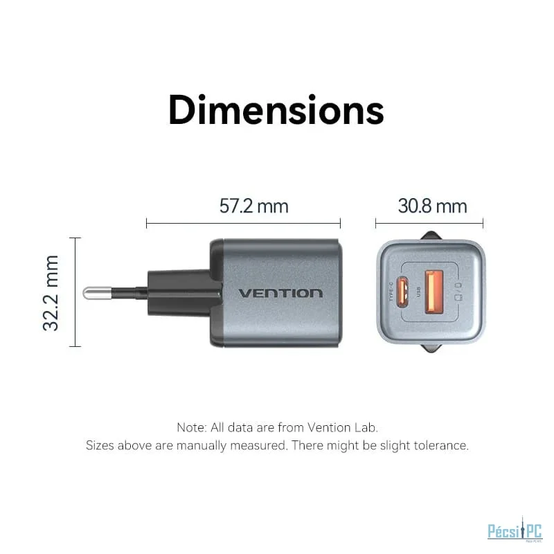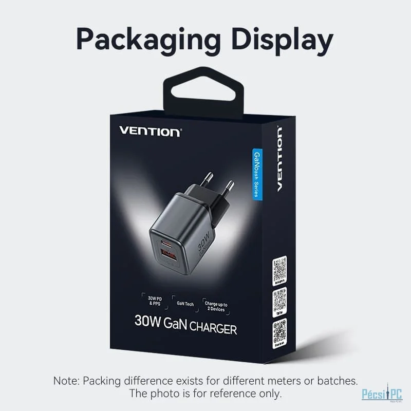 Adapter, 1xUSB-A, 1xUSB-C, 5V/9V/12V/15V/20V, 3A, 30W, QC, PD, Grey