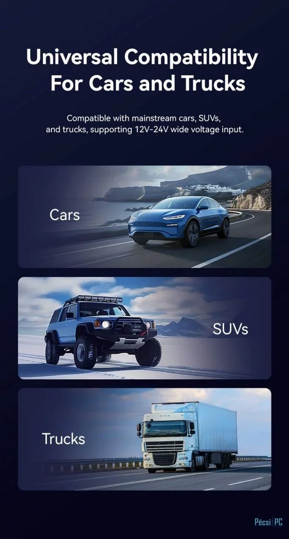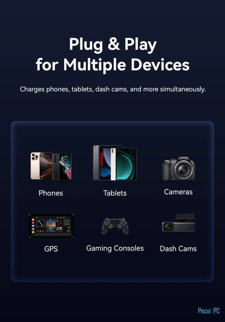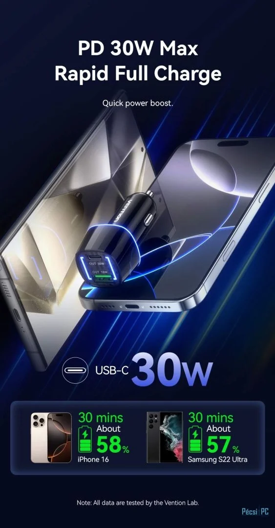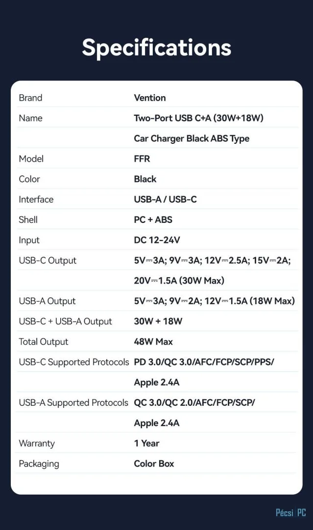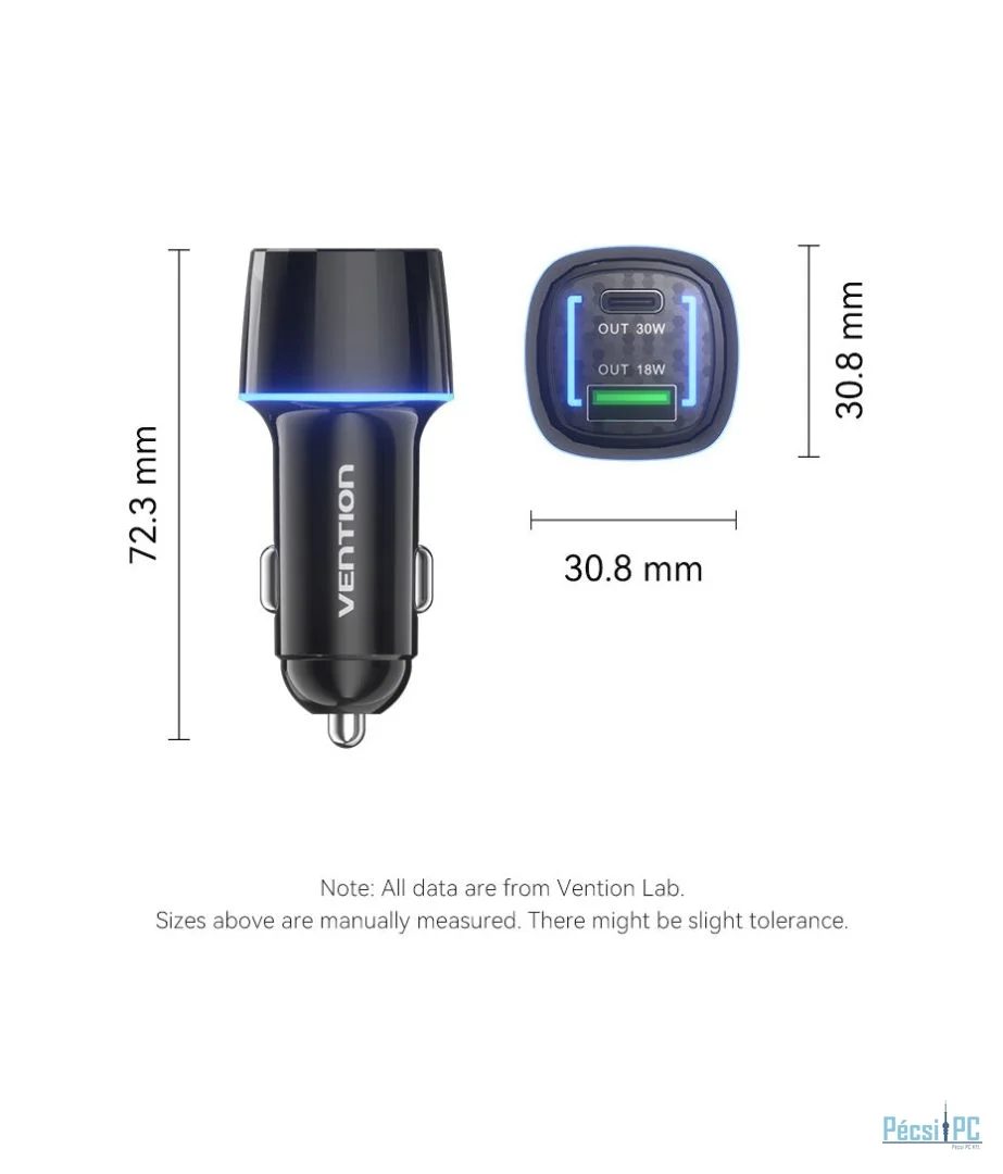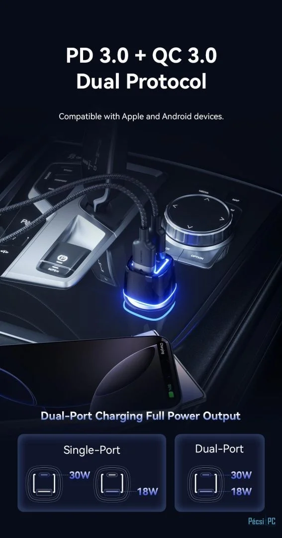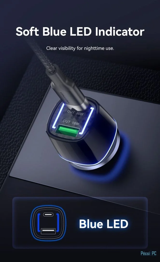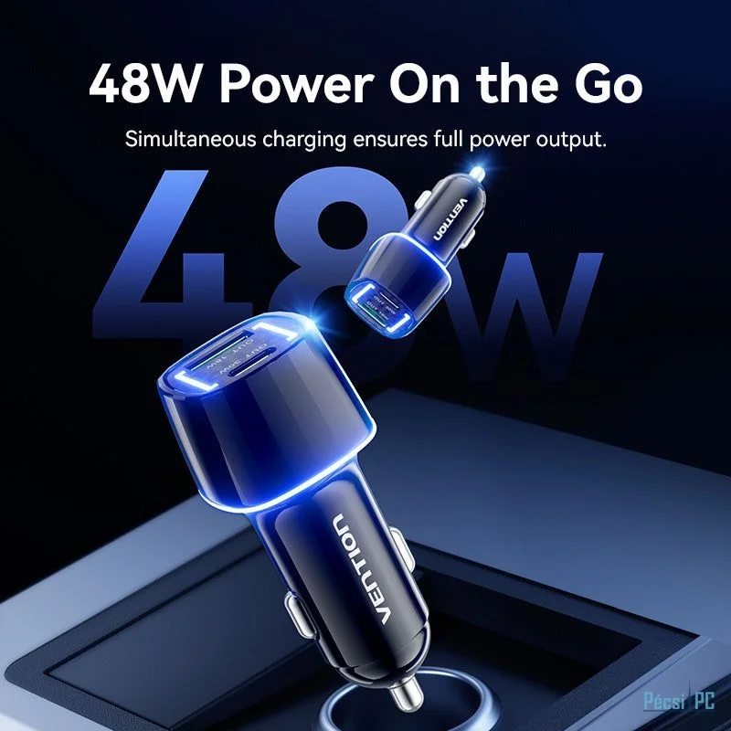 Autós töltő, 1xUSB-A, 1xUSB-C, 5V/9V/12V/15V/20V, 3A, 48W, QC, Black