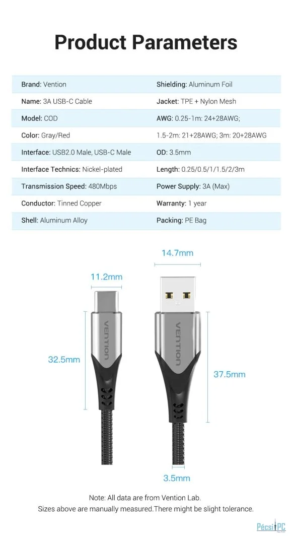 Vention Cotton Braided USB 2.0 A Male to C Male 3A Cable 1m Gray