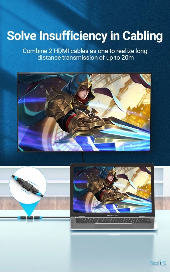 Akár 20 m-es átviteli kiterjesztés: Ez az adapter lenyűgöző képességgel büszkélkedhet, amely akár 20 méteres HDMI átviteli távolságot is képes meghosszabbítani. Két HDMI-kábel kombinálásával könnyedén leküzdheti a szabványos kábelhosszúságok korlátait, így biztosítva, hogy eszközei távolságtól függetlenül csatlakoztathatók legyenek.