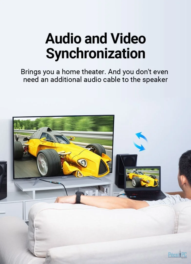 Audió és videó szinkronizálás: Élvezze a hang- és videófolyam kifogástalan szinkronizálását, zökkenőmentes házimozi élményt biztosítva. Nincs szükség további audiokábelre a hangszórókhoz való csatlakozáshoz, így a beállítás egyszerű és problémamentes.