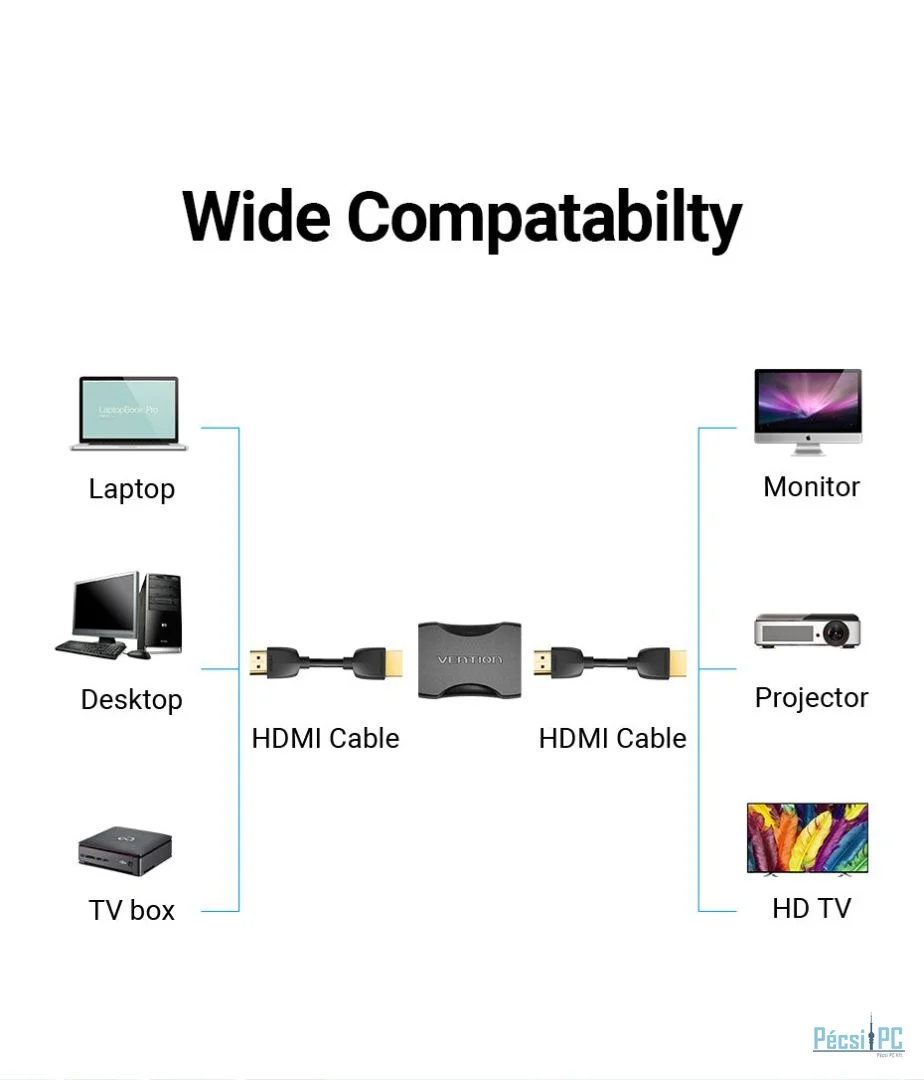 Széles körű kompatibilitás: Ez az adapter számos HDMI-eszközzel kompatibilis, beleértve a laptopokat, asztali számítógépeket, TV-boxokat, HD TV-ket, monitorokat és projektorokat. Sokoldalú megoldást nyújt, amely mind személyes, mind professzionális használatra alkalmas.