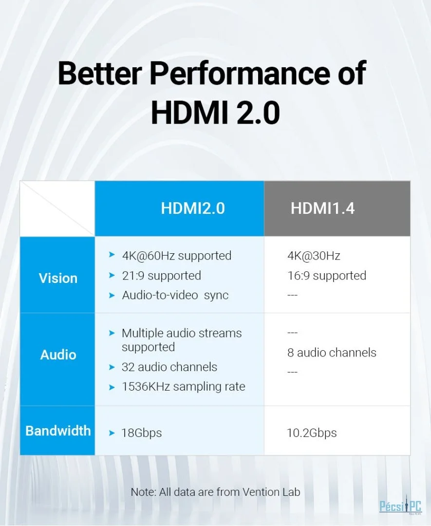 4K Ultra HD látás: Élvezze a lélegzetelállító látványt a 4K UHD felbontással (3840 x 2160). A Vention HDMI csatoló 3 méteres hosszúságon belül támogatja a 4K@60Hz-et, ezen túl pedig akár 1080P felbontást is, így kristálytiszta, élénk képeket biztosít a nézés örömére. A nagy felbontású televíziókhoz, monitorokhoz és projektorokhoz ideális csatoló minden részletet lenyűgöző tisztasággal ad vissza.