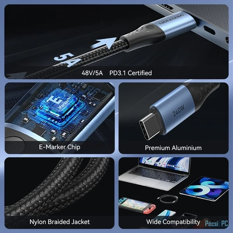 Bemutatjuk a Vention 240W-os USB-C USB-C kábelt: A stílus, a Lightning-gyors töltés és a kivételes tartósság tökéletes keveréke