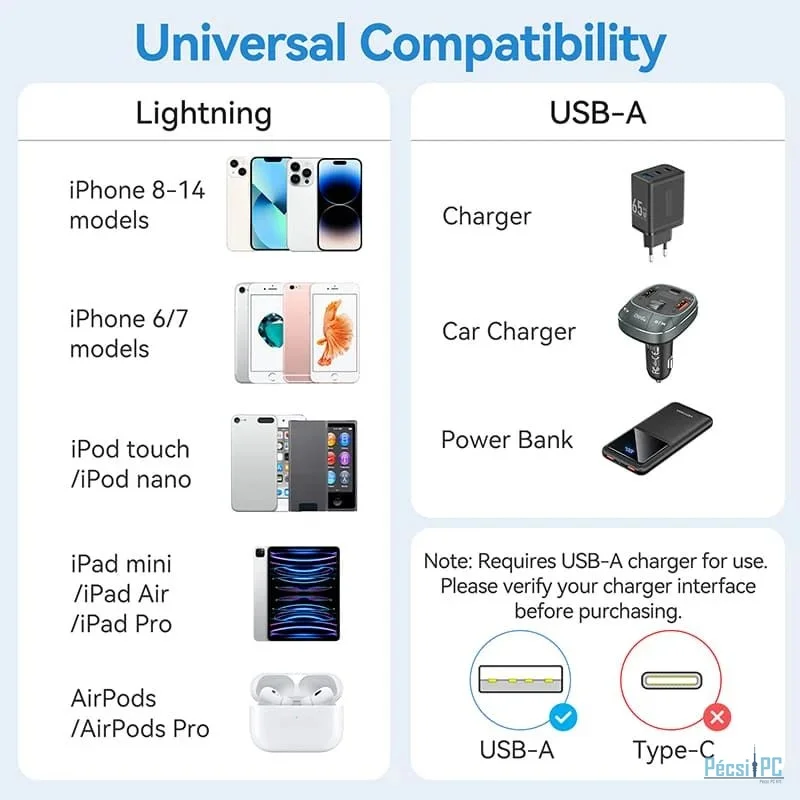 USB kábel, USB-A, Lightning, USB2.0, Male/Male, 1m, White, Töltő és adatkábel