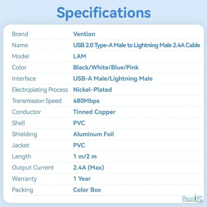 Vention USB 2.0 USB-A to Lightning cable 1m White