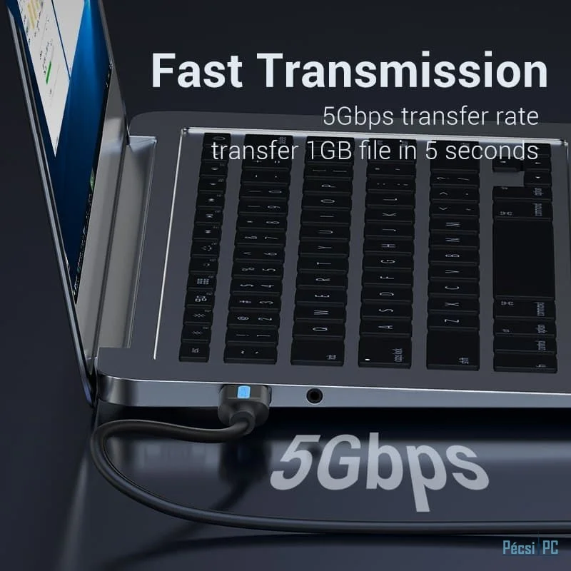Villámgyors adatátvitel: Élvezze az akár 5 Gbps sebességű, villámgyors adatátviteli képességet, amely átalakítja a fájlok mozgatásának módját. Egy méretes, 1 GB-os fájl átvitele mindössze 5 másodperc alatt, minimalizálva az állásidőt és növelve a termelékenységet.
