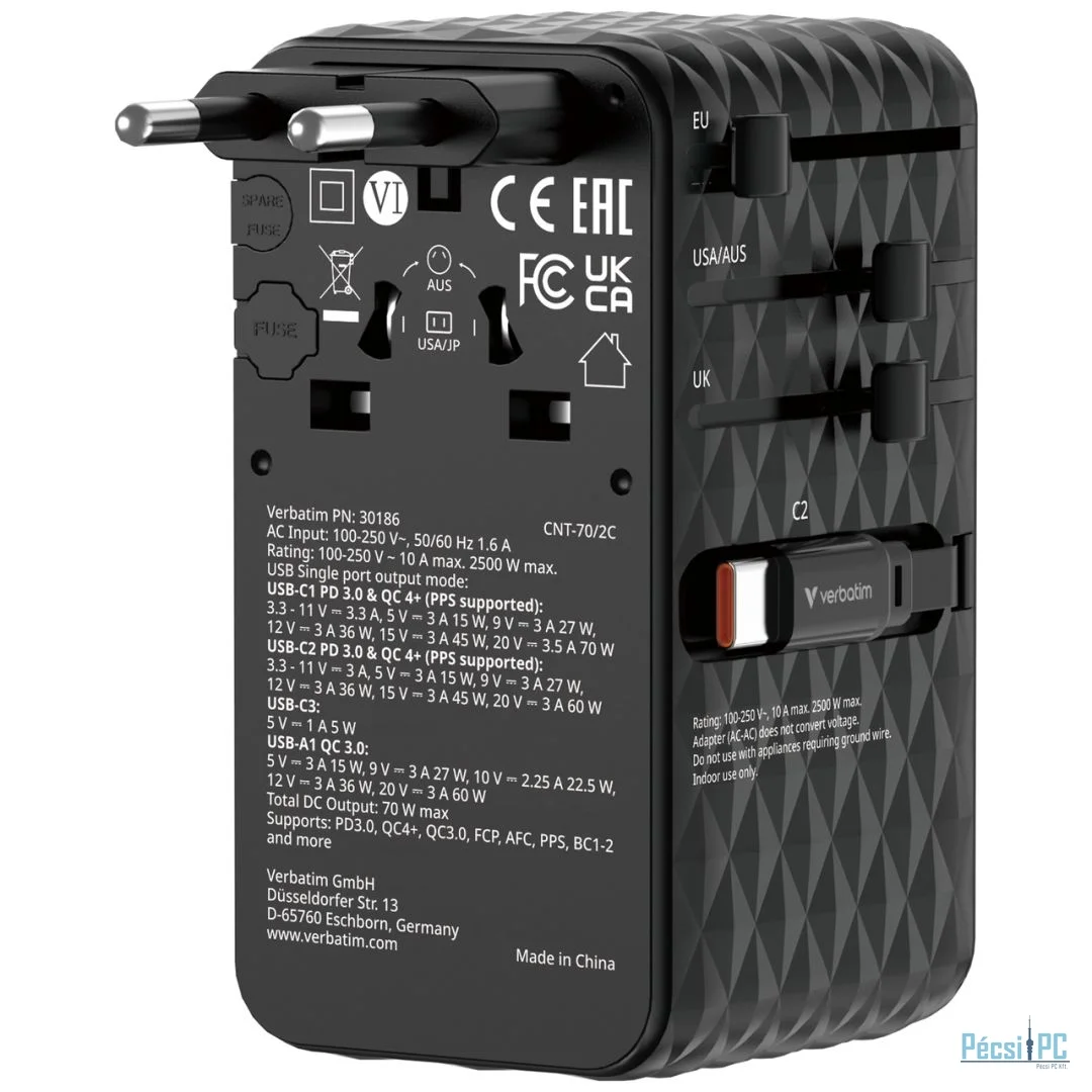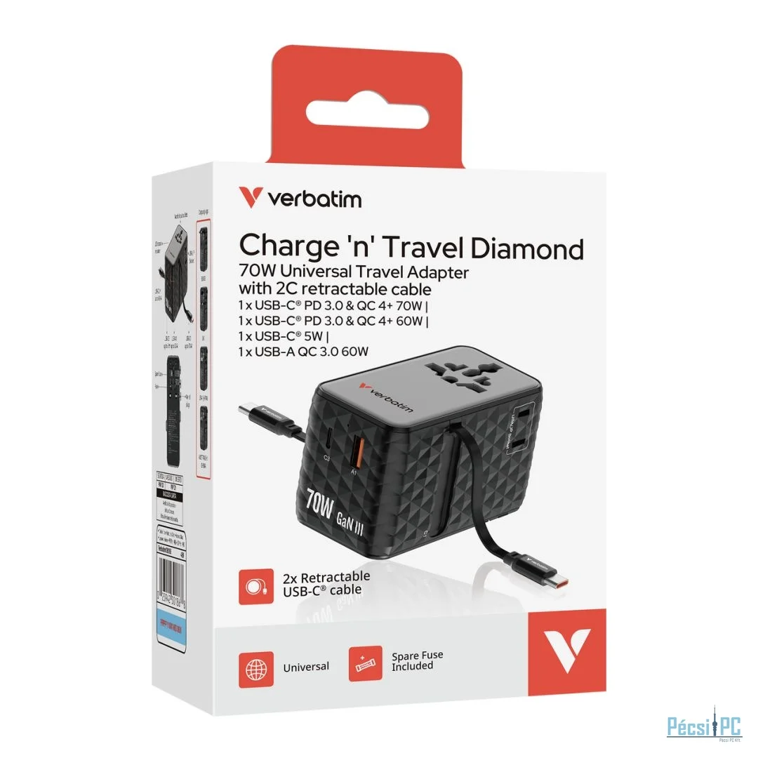 Verbatim Charge ''''n'''' Travel 70W GaN III Universal Travel Adapter with 2 Retractable USB-C Cables Black