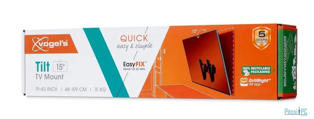 Ezzel a QUICK Tilt TV fali tartóval az egyszerű telepítést és a magas szintű nézési kényelmet választja. A telepítés nagyon egyszerű. Mindössze 20 percet vesz igénybe a TV felakasztása. 5°, 10° vagy 15°-kal döntheti a TV-fali tartót, hogy könnyedén beállíthassa az ideális látószöget. Ez különösen akkor kényelmes, ha a tévéje kissé magasabban van a falra szerelve. A TV-fali tartó 19 és 43 hüvelyk közötti, legfeljebb 15 kg súlyú TV-khez alkalmas.