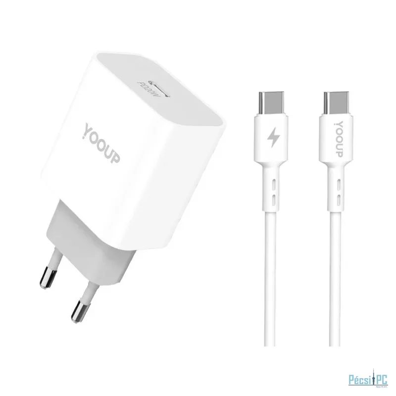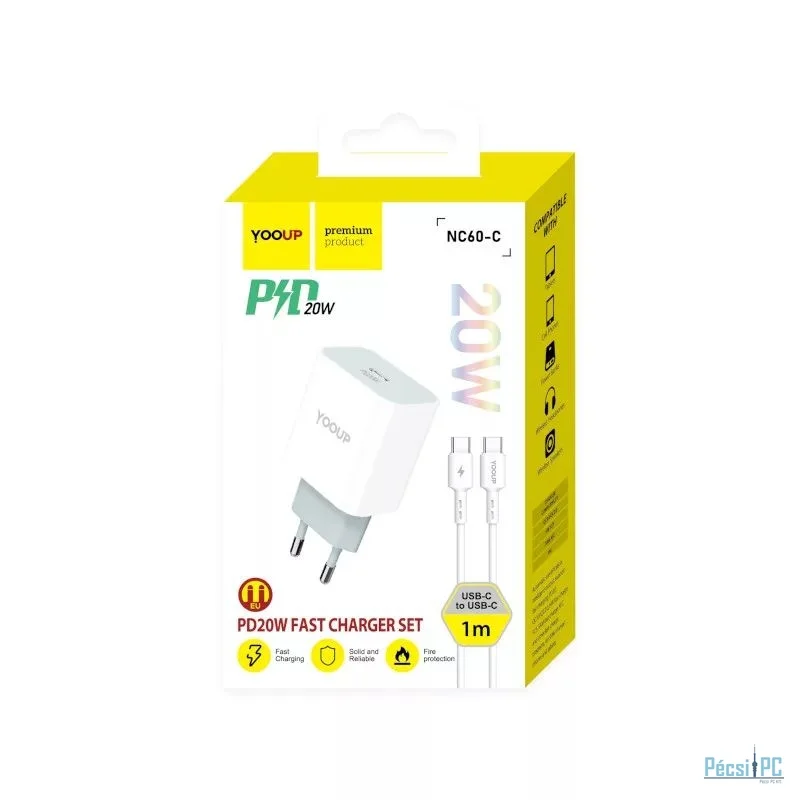 Hálózati töltő, 1xUSB-C, Kábel csatlakozó USB-C , 5V/9V/12V, 3A, 20W, PD, White